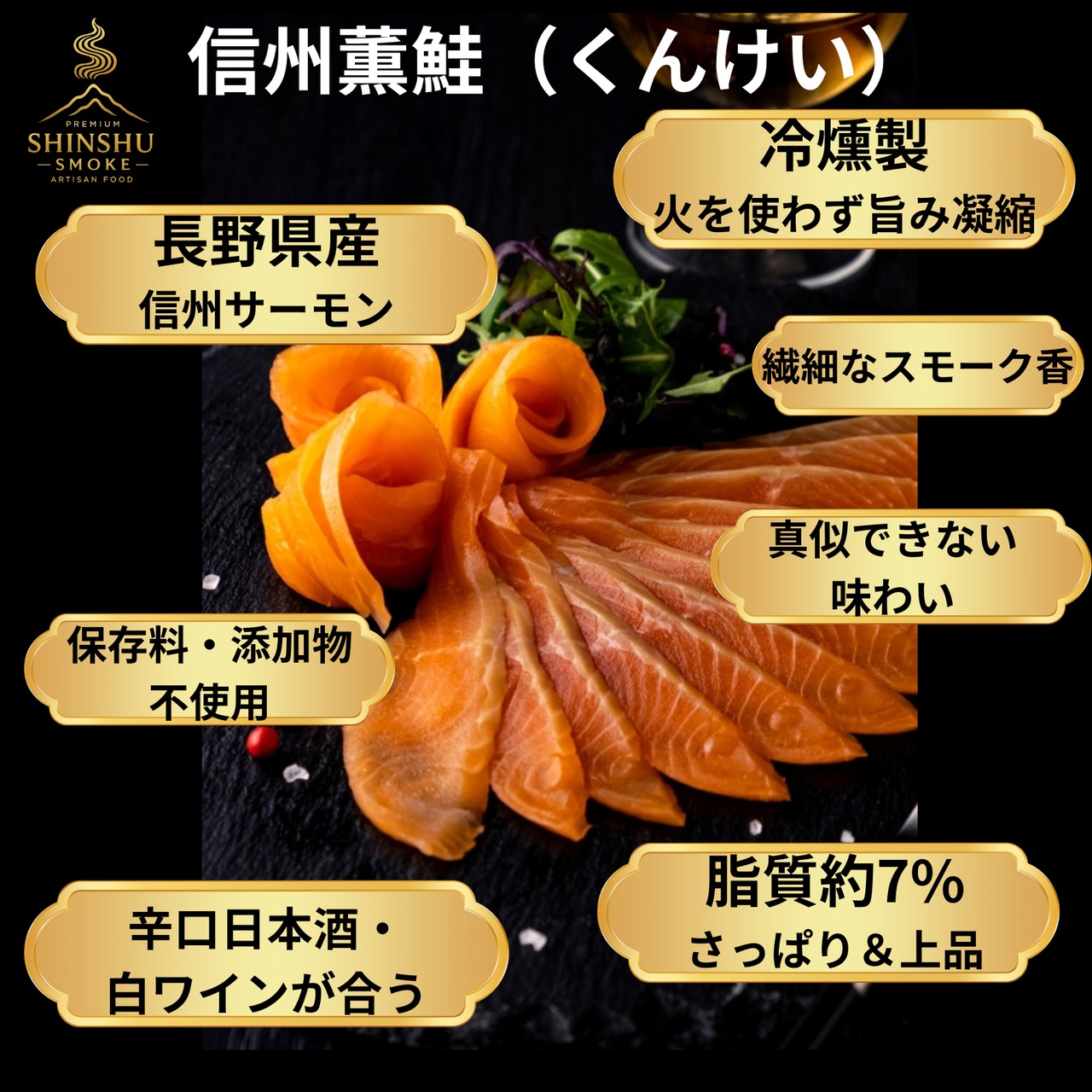信州サーモン:クリアで上品、後味が軽やか。白ワインや日本酒と好相性。