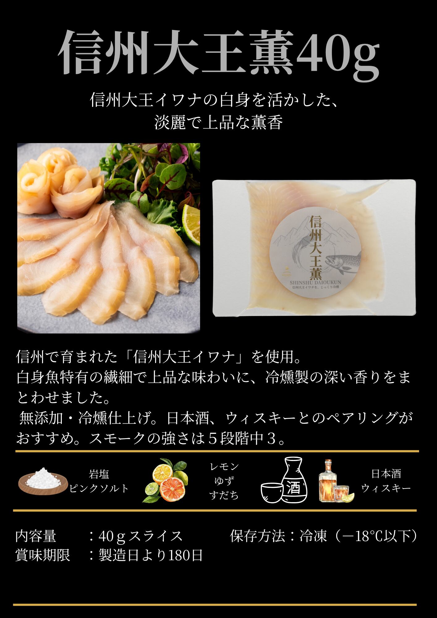 信州スモークは、無添加・冷燻製・HACCP認証工場加工・冷凍保存180日・アニサキスフリー。40g個包装は、ご家庭で楽しみやすい個人向けの設計です。