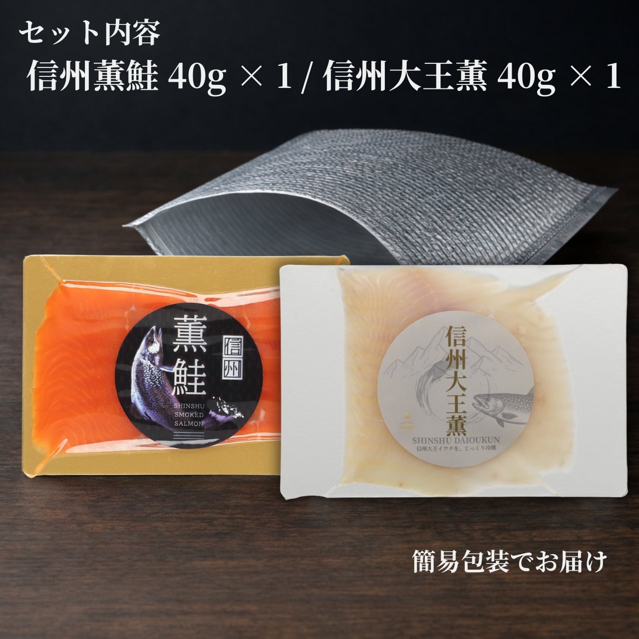 本商品は、信州サーモンを使った定番商品「信州薫鮭」40gと、信州大王イワナの白身を活かした「信州大王薫」40gを、各1パックずつお楽しみいただけるセットです。