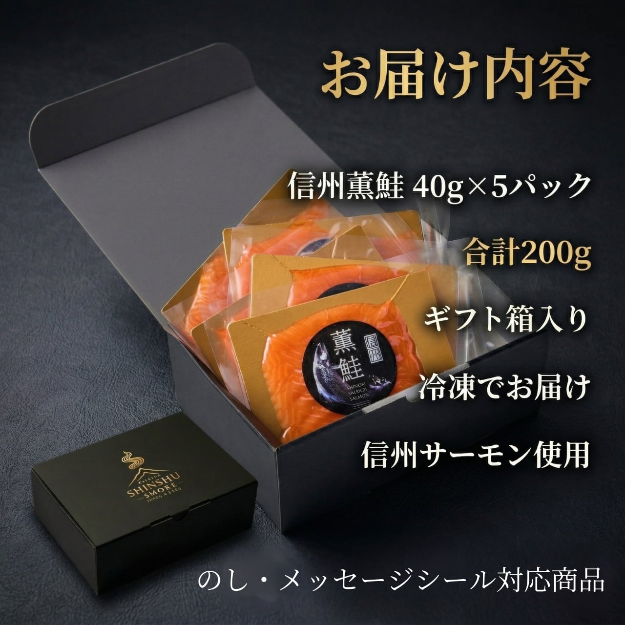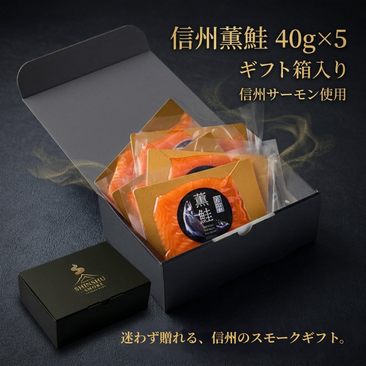 信州産サーモンを使用した無添加・冷燻製のスモークサーモン。贅沢な40g×5パックをギフトBOXに詰め合わせました。お中元やお歳暮などの贈答品としてはもちろん、通販でご自宅用にも人気の高級スモークサーモンです。